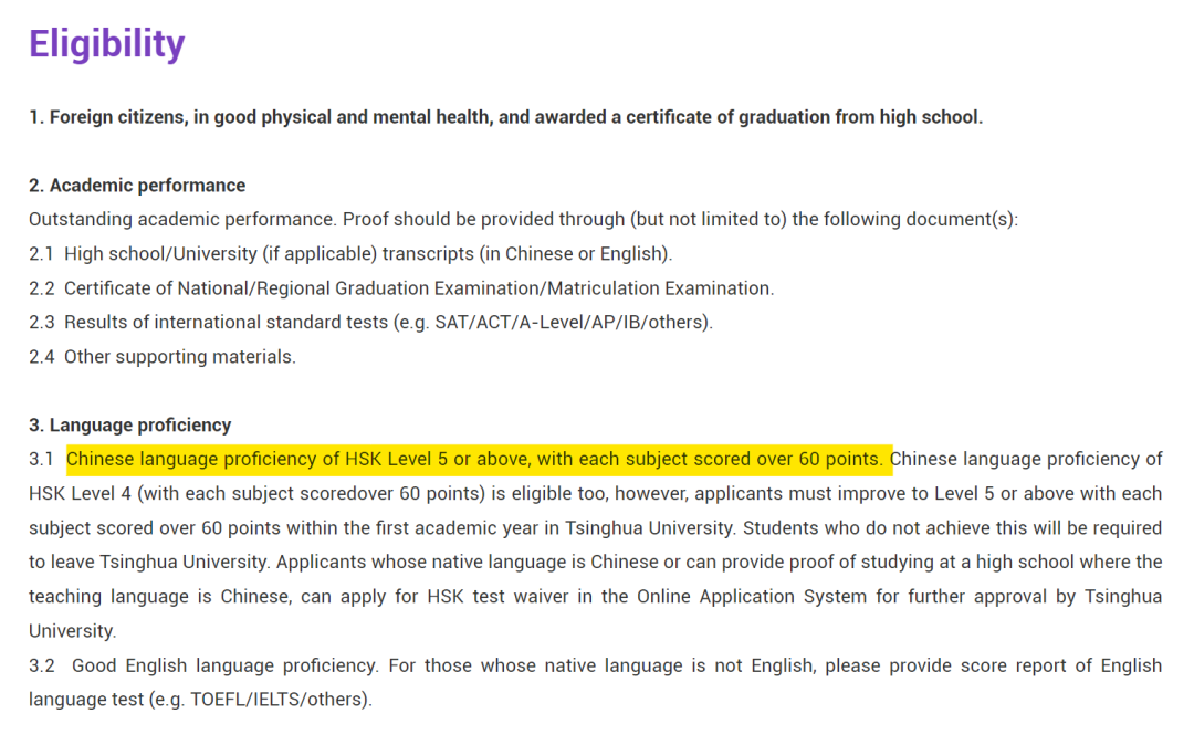 比较著名的如清华大学,其汉语水平要求达到HSK5级: